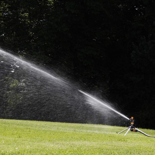Impulstipa laistītājs ar trim alumīnija kājām. Iespēja iestatīt nepieciešamo laistīšanas leņķi no 0-360 grādiem. Laistīšanas laukums 227-491m2 atkarībā no spiediena ūdensvadā.
